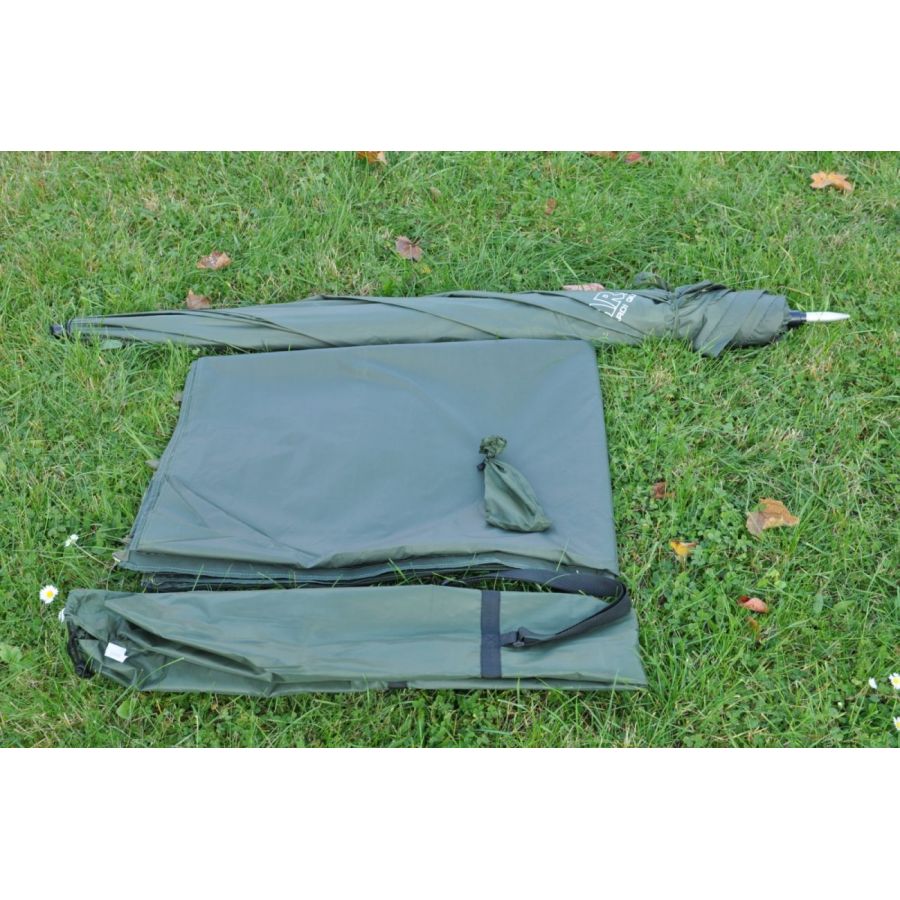 Kvalitný dáždnik s kĺbom a bočnicami. Je vybavený hrubostennou tyčou, odolnou proti deformácii. Poťah je vyrobený z ľahkého, avšak 100% nepriepustného "pogumovaného" materiálu zelenej farby s lepenými švami.