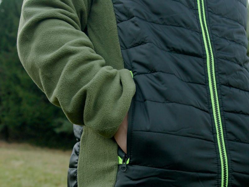 Stred bundy tvorí ľahký, prešívaný panel, ktorý účinne chráni pred vetrom a chladom, zatiaľ čo rukávy, boky a kapucňa sú pre maximálne pohodlie a voľnosť pohybu vyrobené z na dotyk prijemného mäkkého flísu, ktorý zahreje aj počas sychravých dní. Nastaviteľná kapucňa je zvnútra doplnená priedušnou sieťkou, ktorá zvyšuje komfort pri aktívnom nosení a zabezpečuje lepšiu ventiláciu.