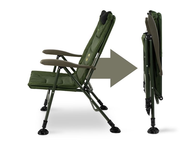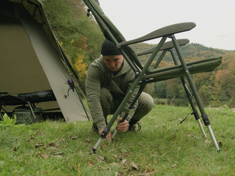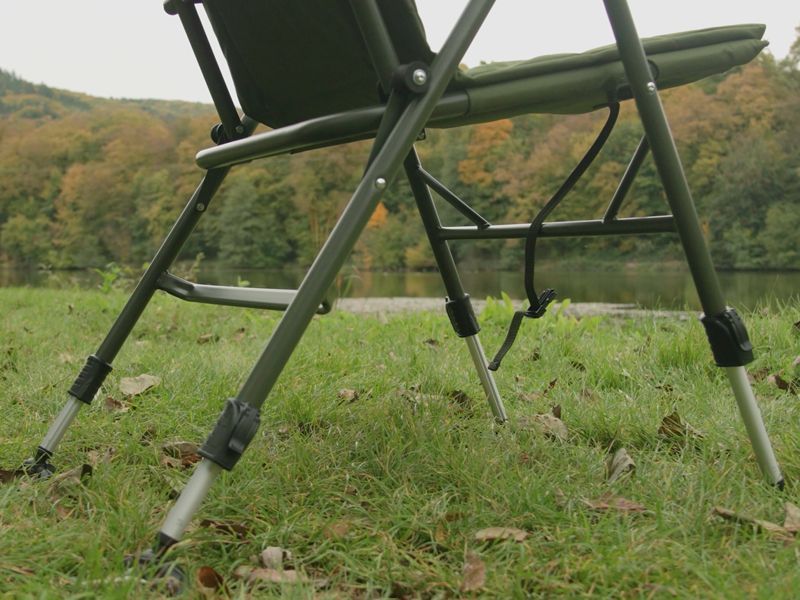 Výškovo nastaviteľné nohy umožňujú prispôsobiť kreslo nerovnému terénu a zaručujú stabilitu aj v náročných podmienkach. O bezpečné zaistenie polohy sa starajú flexibilné robustné pätky, ktorých veľká plocha účinne zabraňuje zabáraniu nôh do mäkkej pôdy pri vode. Navyše je kreslo vybavené plastovým klipom, ktorý fixuje jeho polohu počas prevozu a predchádza nechcenému roztváraniu.