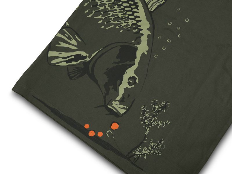 Séria CATCH ME IF YOU CAN (chyť ma, ak to dokážeš) s vyobrazením kapra je nevšedný kúsok do vášho, nielen kaprárskeho šatníka. Maľba kapra prechádza dookola celého trupu v jeho spodnej časti. Kapor je zobrazený ako skica, či maľba pri zachovaní všetkých dôležitých detailov. Ryba je zachytená v situácii, kedy sa blíži k hrsti boilies, čo je práve ten moment, na ktorý všetci na brehu čakáme. Tričko je dizajnované do tmavozelenej farby s efektnou oranžovou a svetlozelenou grafikou.