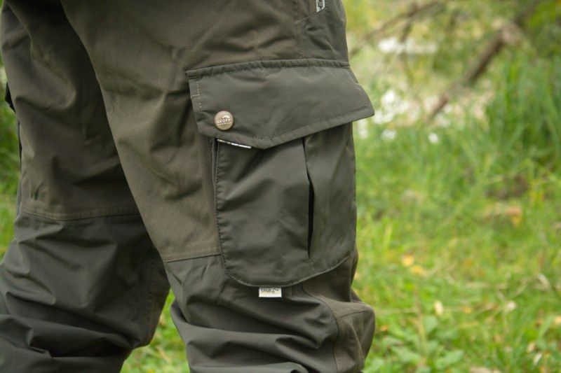 Praktické vrecká na bokoch rybárskych nohavíc Urus 6 sú svojim strihom automaticky pri zatvorení chránené pred dažďom, snehom a vetrom. Svojim špeciálnym tvarom sú vhodné aj na väčšie rybárske potreby, rybárske krabičky bez pocitu záťaže a následného rizika vypadnutia . Samozrejmosťou u bočných vreciek je všité púzdro na mobilný telefón. (len v pravom vrecku).